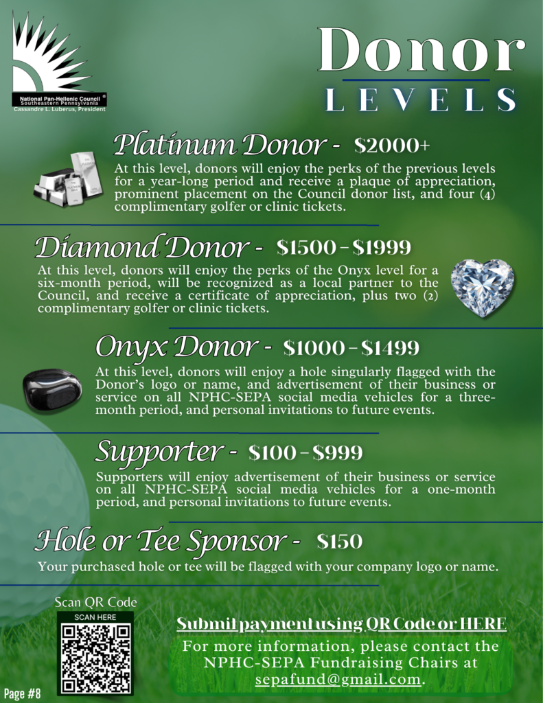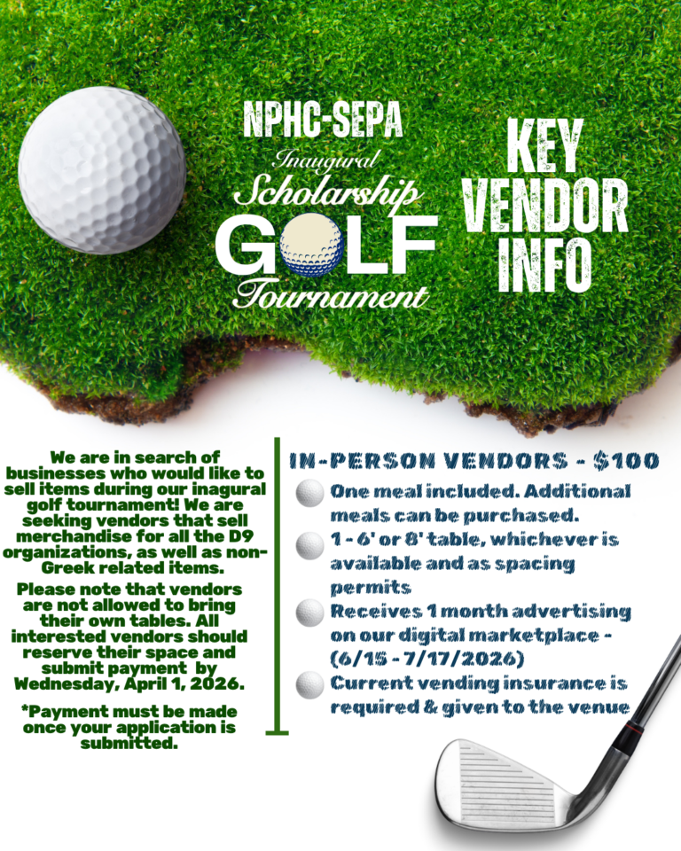 The National Pan-Hellenic Council of Southeastern Pennsylvania will host its Inaugural Scholarship Golf Tournament & Day Party on Thursday, June 18, 2026 at Five Ponds Golf Club, 1225 W Street Rd, Warminster, PA 18974. This auspicious occasion features participation opportunities for individual golfers, foursomes, mulligans, and a 2-hr golf clinic. There will be awards and vendors. The day party includes a buffet and cash bar. Hotel Options are available, as well. Partial proceeds will benefit NPHC-SEPA Scholarships.